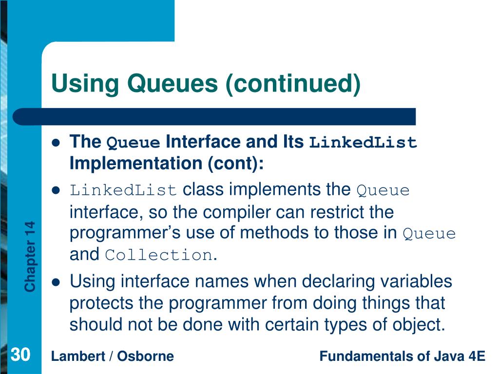 Using Queues (continued) • The Queue Interface and Its LinkedList Implementation (cont): • LinkedList class implements the Queue interface, so the compiler can restrict the programmer’s use of methods to those in Queue and Collection. • Using interface names when declaring variables protects the programmer from doing things that should not be done with certain types of object. 30 30