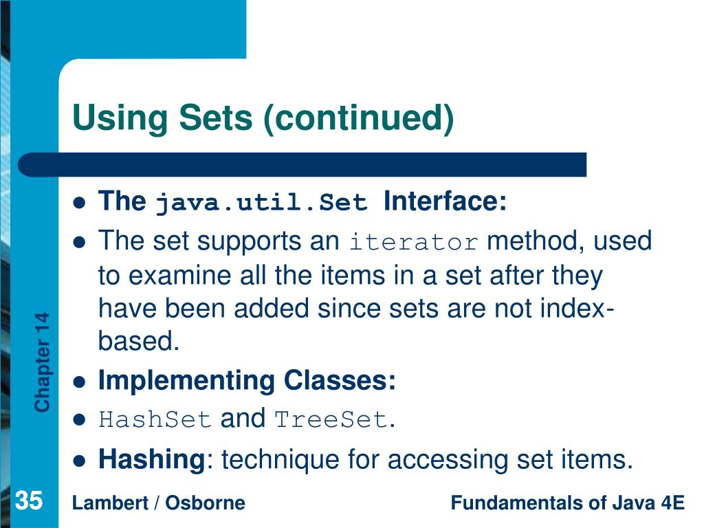 Using Sets (continued) • The java.util.Set Interface: • The set supports an iterator method, used to examine all the items in a set after they have been added since sets are not index-based. • Implementing Classes: • HashSet and TreeSet. • Hashing: technique for accessing set items. 35 35