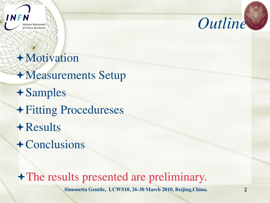 Outline • Motivation • Measurements Setup • Samples • Fitting Procedureses • Results • Conclusions • The results presented are preliminary. Simonetta Gentile, LCWS10, 26-30 March 2010, Beijing,China.