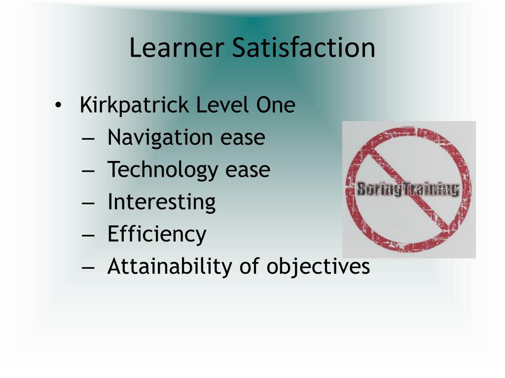 Learner Satisfaction • Kirkpatrick Level One • Navigation ease • Technology ease • Interesting • Efficiency • Attainability of objectives