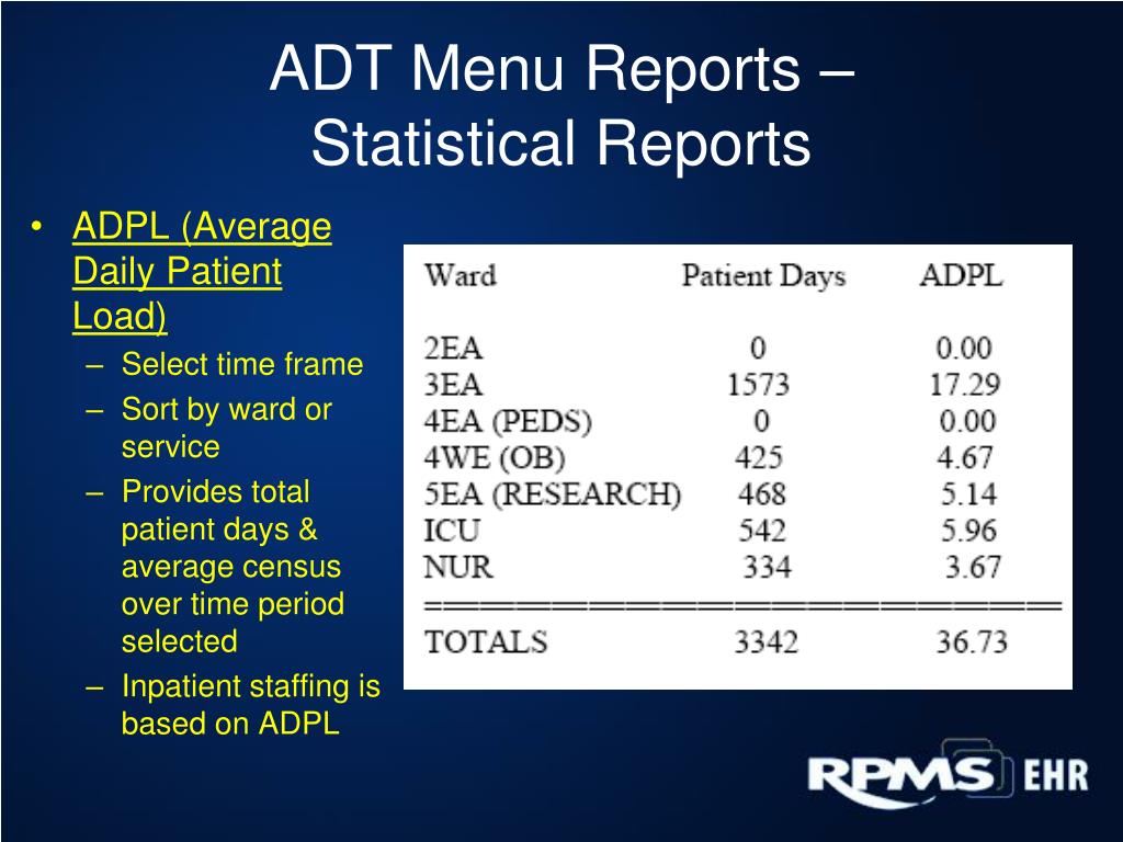 ADPL (Average Daily Patient Load) Select time frame Sort by ward or service Provides total patient days & average census over time period selected Inpatient staffing is based on ADPL ADT Menu Reports – Statistical Reports