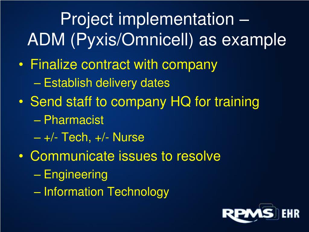 Project implementation – ADM (Pyxis/Omnicell) as example • Finalize contract with company • Establish delivery dates • Send staff to company HQ for training • Pharmacist • +/- Tech, +/- Nurse • Communicate issues to resolve • Engineering • Information Technology