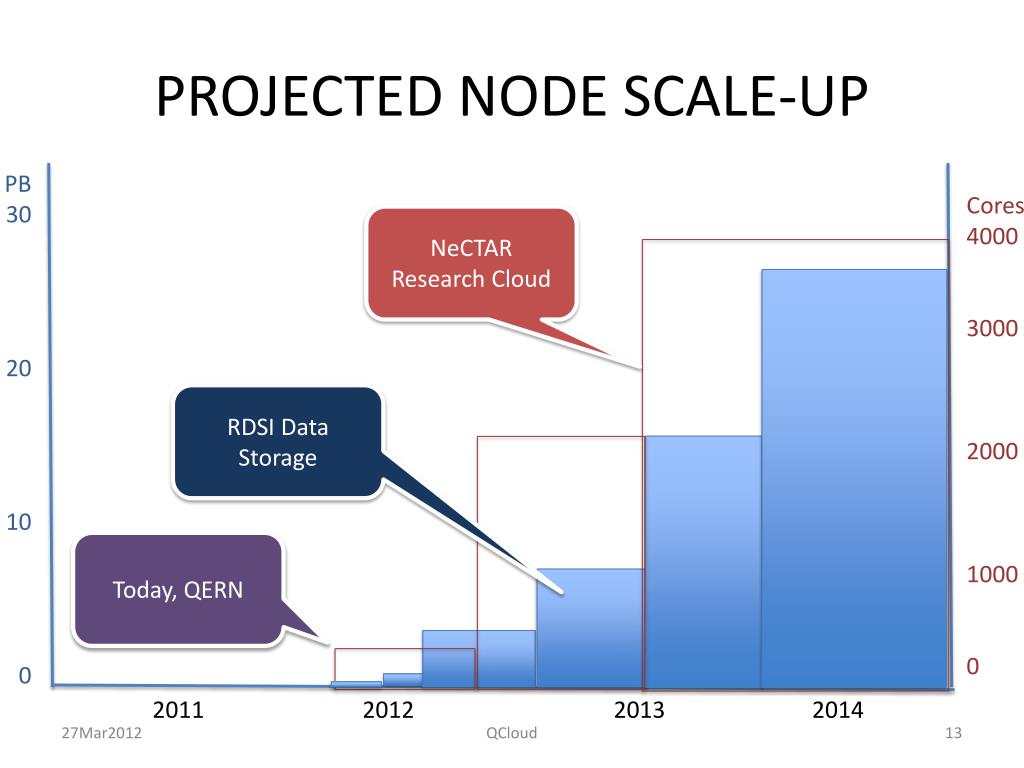 PROJECTED NODE SCALE-UP PB 30 20 10 0 Cores 4000 3000 2000 1000 0 NeCTAR Research Cloud RDSI Data Storage Today, QERN 2011 2012 2013 2014 QCloud