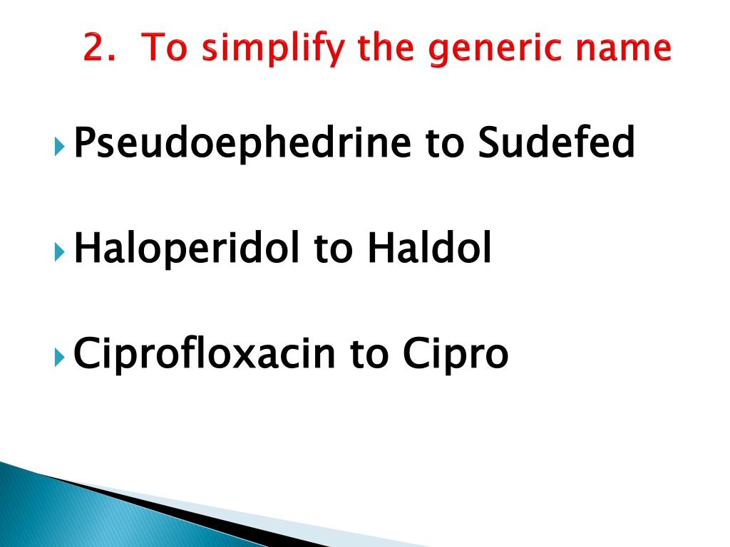 2. To simplify the generic name • Pseudoephedrine to Sudefed • Haloperidol to Haldol • Ciprofloxacin to Cipro