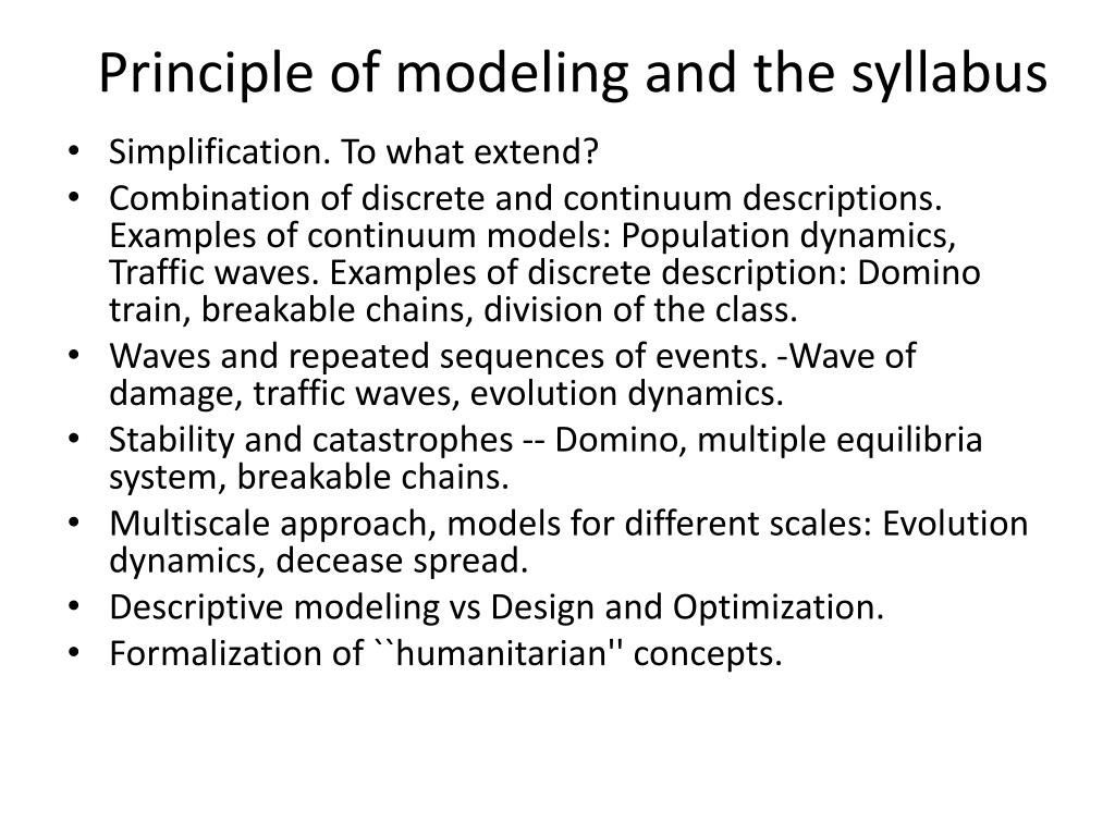 Principle of modeling and the syllabus • Simplification. To what extend? • Combination of discrete and continuum descriptions. Examples of continuum models: Population dynamics, Traffic waves. Examples of discrete description: Domino train, breakable chains, division of the class. • Waves and repeated sequences of events. -Wave of damage, traffic waves, evolution dynamics. • Stability and catastrophes -- Domino, multiple equilibria system, breakable chains. • Multiscale approach, models for different scales: Evolution dynamics, decease spread. • Descriptive modeling vs Design and Optimization. • Formalization of ``humanitarian'' concepts.