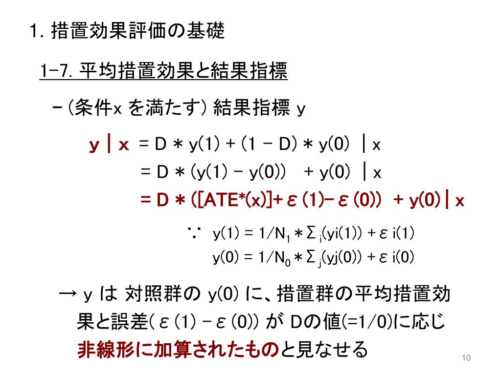 1. 措置効果評価の基礎 1-6+. 平均措置効果の推計 - (条件x を満たす) 平均措置効果 (ATE(x))の推計 観察値 y(t) 措置群 ya 対照群 yb (時間) 0 tz▲ tz+s (措置 X) 「真の効果」 (観察不能) ya(1,tz+s) (ya(0,tz+s); 不存在) Dtz+s - Dtz (ATE(x)) ya(0,tz) Dtz+s Dtz yb(0,tz+s) yb(0,tz) 9