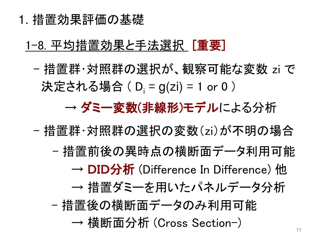 1. 措置効果評価の基礎 1-8. 平均措置効果と手法選択 [重要] - 措置群・対照群の選択が、観察可能な変数 zi で 決定される場合 ( Di = g(zi) = 1 or 0 ) → ダミー変数(非線形)モデルによる分析 - 措置群・対照群の選択の変数(zi)が不明の場合 - 措置前後の異時点の横断面データ利用可能 → DID分析 (Difference In Difference) 他 → 措置ダミーを用いたパネルデータ分析 - 措置後の横断面データのみ利用可能 → 横断面分析 (Cross Section-) 11