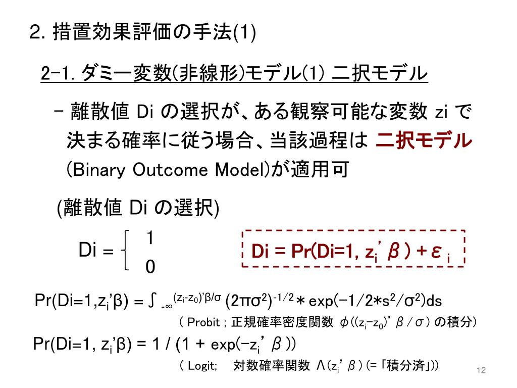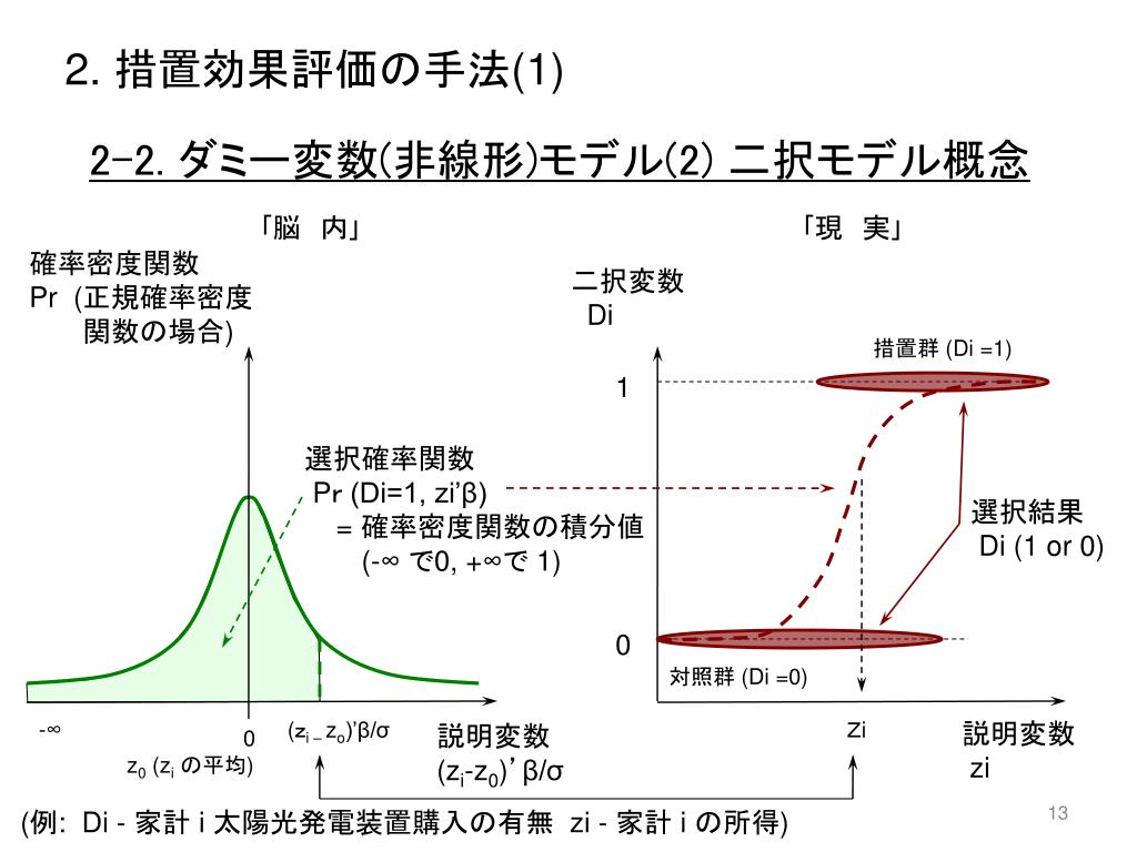 Di = Di = Pr(Di=1, zi’β)+εi 2. 措置効果評価の手法(1) 2-1. ダミー変数(非線形)モデル(1) 二択モデル - 離散値 Di の選択が、ある観察可能な変数 zi で 決まる確率に従う場合、当該過程は 二択モデル (Binary Outcome Model)が適用可 (離散値 Di の選択) 1 0 Pr(Di=1,zi’β)=∫-∞(zi-z0)’β/σ (2πσ2)-1/2*exp(-1/2*s2/σ2)ds ( Probit ; 正規確率密度関数 φ((zi-z0)’β/σ) の積分) Pr(Di=1, zi’β) = 1 / (1 +exp(-zi’β)) ( Logit; 対数確率関数 Λ(zi’β)(= 「積分済」)) 12