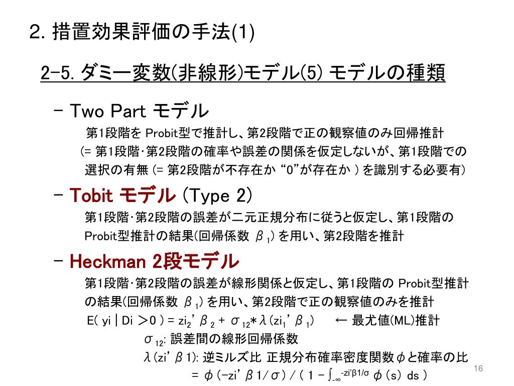 「脳 内」 「現 実」 選択ダミー変数 の誤差 ε1i = Di* - zi’β1 (正規分布を仮定) 結果指標 yi (観察可) ダミー変数 Di, Di* (観察不可) 措置群 (Di=1) 措置群 (Di=1) 1 yi 結果指標の誤差 ε2i (ε1i との関 係を仮定) 選択ダミ-関数 Di* = zi’β1 + ε1i 結果指標 yi* = zi’β2 + ε2i (or 0 ) 選択ダミー Di (1 or 0) 0 0 対照群 (Di=0) 対照群 (Di=0) → yi = 0 Zc (Di* = 0) Zc ( ? ) 説明変数 zi (観察可) 説明変数 zi (観察可) 2. 措置効果評価の手法(1) 2-4. ダミー変数(非線形)モデル(4) 推計の概念 15 (例: yi - 家計 i の太陽光発電量 Di – 装置購入ダミー(観察不可)zi - 家計 i の所得)
