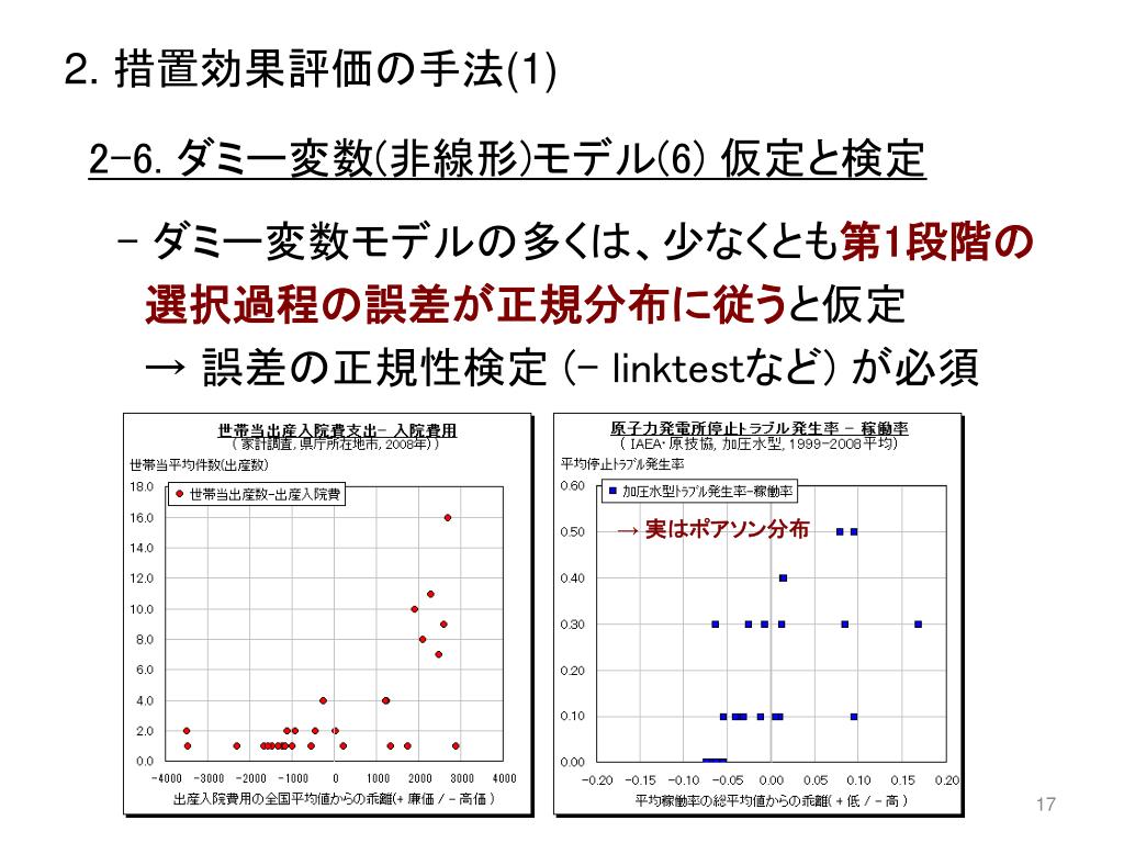 2. 措置効果評価の手法(1) 2-5. ダミー変数(非線形)モデル(5) モデルの種類 - Two Part モデル 第1段階を Probit型で推計し、第2段階で正の観察値のみ回帰推計 (= 第1段階・第2段階の確率や誤差の関係を仮定しないが、第1段階での 選択の有無 (= 第2段階が不存在か “0”が存在か ) を識別する必要有) - Tobit モデル (Type 2) 第1段階・第2段階の誤差が二元正規分布に従うと仮定し、第1段階の Probit型推計の結果(回帰係数 β1) を用い、第2段階を推計 - Heckman 2段モデル 第1段階・第2段階の誤差が線形関係と仮定し、第1段階の Probit型推計 の結果(回帰係数 β1) を用い、第2段階で正の観察値のみを推計 E( yi | Di >0 ) = zi2’β2 + σ12*λ(zi1’β1) ← 最尤値(ML)推計 σ12: 誤差間の線形回帰係数 λ(zi’β1): 逆ミルズ比 正規分布確率密度関数φと確率の比 = φ(-zi’β1/σ) / ( 1 - ∫-∞-zi’β1/σ φ(s) ds ) 16