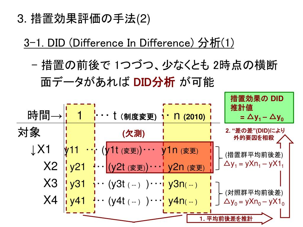 措置効果の DID 推計値 = △y1 – △y0 2. “差の差”(DID)により 外的要因を相殺 (措置群平均前後差) △y1 = yXn1 – yX11 (対照群平均前後差) △y0 = yXn0 – yX10 3. 措置効果評価の手法(2) 3-1. DID (Difference In Difference) 分析(1) - 措置の前後で 1つづつ、少なくとも 2時点の横断 面データがあれば DID分析 が可能 時間→ 1 ・・・ t (制度変更) ・・ n (2010) 対象 (欠測) ↓X1 y11 ・・・ (y1t (変更))・・・ y1n (変更) X2 y21 ・・・ (y2t (変更))・・・ y2n (変更) X3 y31 ・・・ (y3t ( -- ) )・・・ y3n( -- ) X4 y41 ・・・ (y4t ( -- ) )・・・ y4n( -- ) 1. 平均前後差を推計