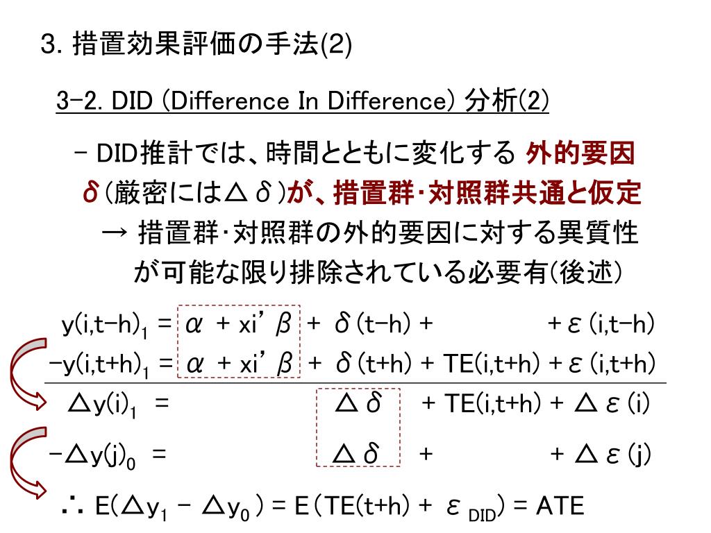 3. 措置効果評価の手法(2) 3-2. DID (Difference In Difference) 分析(2) - DID推計では、時間とともに変化する 外的要因 δ(厳密には△δ)が、措置群・対照群共通と仮定 → 措置群・対照群の外的要因に対する異質性 が可能な限り排除されている必要有(後述) y(i,t-h)1 = α + xi’β + δ(t-h) + +ε(i,t-h) -y(i,t+h)1 = α + xi’β + δ(t+h) + TE(i,t+h) +ε(i,t+h) △y(i)1 = △δ + TE(i,t+h) + △ε(i) -△y(j)0 = △δ + + △ε(j) ∴ E(△y1 - △y0 ) = E(TE(t+h) + εDID) = ATE