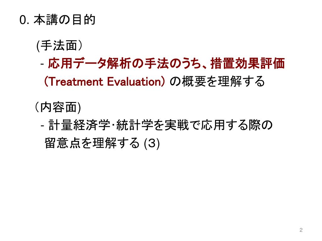 0. 本講の目的 (手法面) - 応用データ解析の手法のうち、措置効果評価 (Treatment Evaluation) の概要を理解する (内容面) - 計量経済学・統計学を実戦で応用する際の 留意点を理解する (3)
