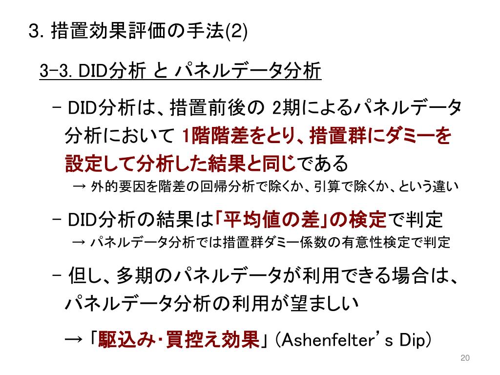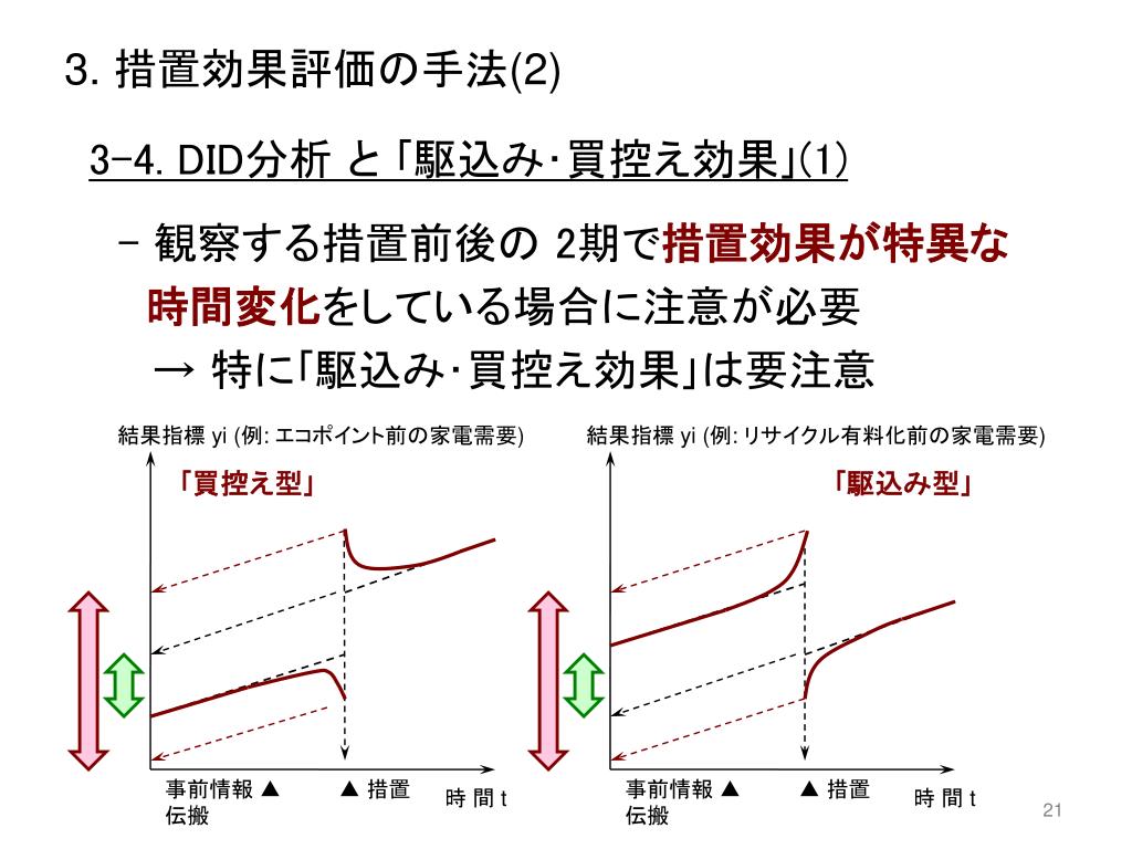 3. 措置効果評価の手法(2) 3-3. DID分析 と パネルデータ分析 - DID分析は、措置前後の 2期によるパネルデータ 分析において1階階差をとり、措置群にダミーを 設定して分析した結果と同じである →外的要因を階差の回帰分析で除くか、引算で除くか、という違い - DID分析の結果は「平均値の差」の検定で判定 → パネルデータ分析では措置群ダミー係数の有意性検定で判定 - 但し、多期のパネルデータが利用できる場合は、 パネルデータ分析の利用が望ましい → 「駆込み・買控え効果」 (Ashenfelter’s Dip) 20