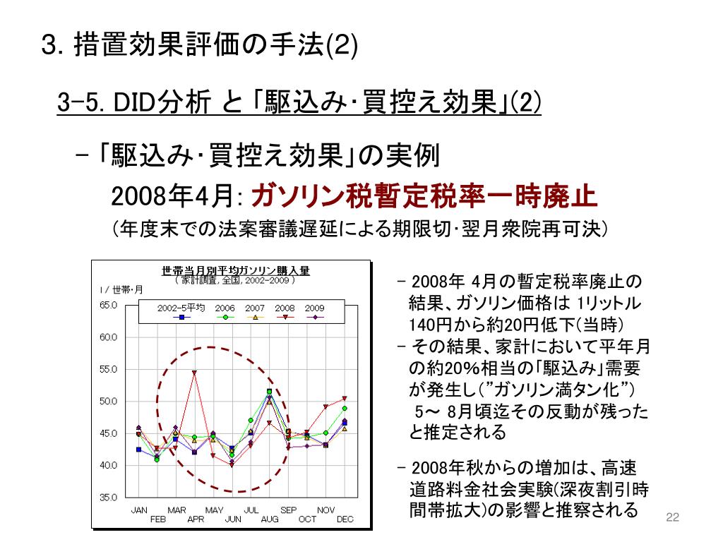 2008年 4月の暫定税率廃止の 結果、ガソリン価格は 1リットル 140円から約20円低下(当時) • その結果、家計において平年月 の約20%相当の「駆込み」需要 が発生し(”ガソリン満タン化”) 5~ 8月頃迄その反動が残った と推定される • 2008年秋からの増加は、高速 道路料金社会実験(深夜割引時 間帯拡大)の影響と推察される 3. 措置効果評価の手法(2) 3-5. DID分析 と 「駆込み・買控え効果」(2) - 「駆込み・買控え効果」の実例 2008年4月: ガソリン税暫定税率一時廃止 (年度末での法案審議遅延による期限切・翌月衆院再可決) 22