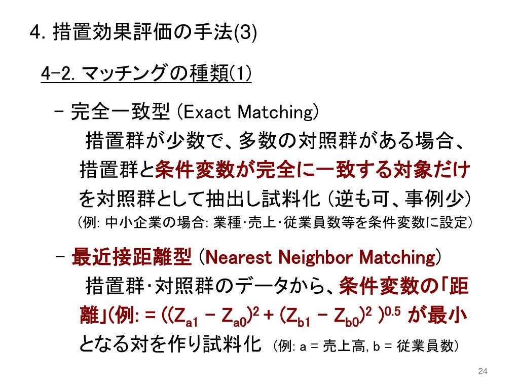 4. 措置効果評価の手法(3) 4-1. マッチングによるデータ予備処理(1) - DID分析 や パネルデータ分析 などにおいて、 措置群・対照群間での対象の異質性を軽減する 方法として、マッチングによるデータ予備処理が 注目されている - マッチングとは、措置群・対照群の横断面データ を幾つかの変数(”条件変数”)を用いて分類し、 当該分類された措置群・対照群が対応するよう (“Match”, = 異質性が少ない) データを選別した 上で分析すること 23