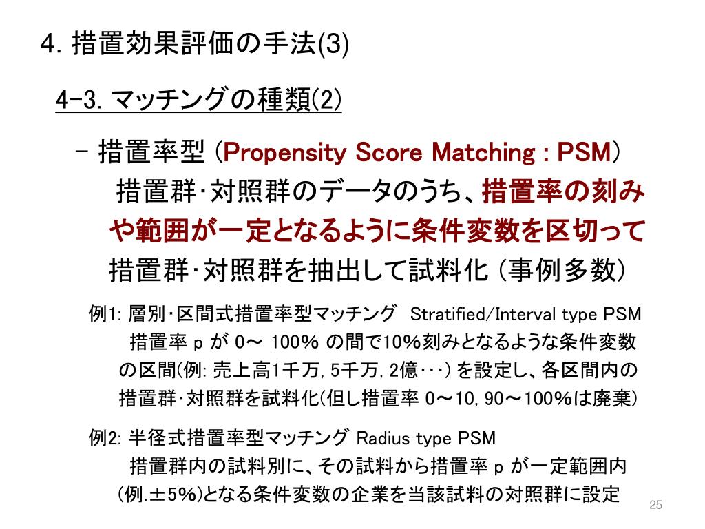 4. 措置効果評価の手法(3) 4-2. マッチングの種類(1) - 完全一致型 (Exact Matching) 措置群が少数で、多数の対照群がある場合、 措置群と条件変数が完全に一致する対象だけ を対照群として抽出し試料化 (逆も可、事例少) (例: 中小企業の場合: 業種・売上・従業員数等を条件変数に設定) - 最近接距離型(Nearest Neighbor Matching) 措置群・対照群のデータから、条件変数の「距 離」(例: = ((Za1 – Za0)2 + (Zb1 – Zb0)2 )0.5が最小 となる対を作り試料化 (例: a = 売上高, b = 従業員数) 24