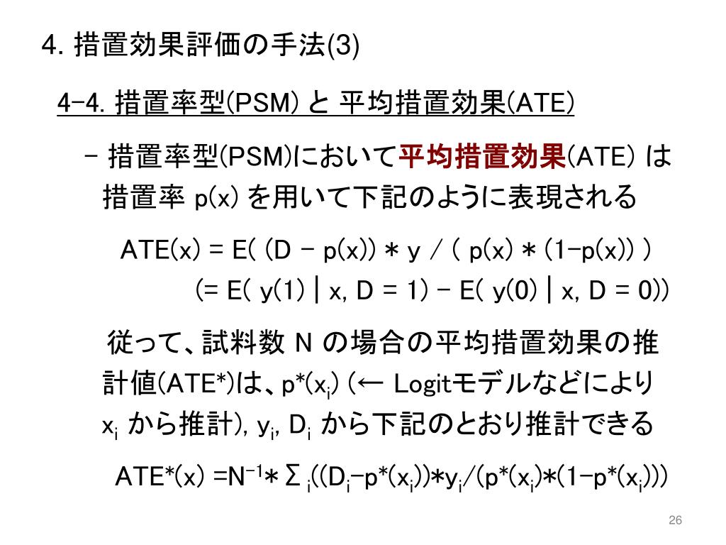 4. 措置効果評価の手法(3) 4-4. 措置率型(PSM) と 平均措置効果(ATE) - 措置率型(PSM)において平均措置効果(ATE) は 措置率 p(x) を用いて下記のように表現される ATE(x) = E( (D – p(x)) * y / ( p(x) * (1-p(x)) ) (= E( y(1) | x, D = 1) – E( y(0) | x, D = 0)) 従って、試料数 N の場合の平均措置効果の推 計値(ATE*)は、p*(xi) (← Logitモデルなどにより xiから推計), yi, Diから下記のとおり推計できる ATE*(x) =N-1*Σi((Di–p*(xi))*yi/(p*(xi)*(1-p*(xi))) 26