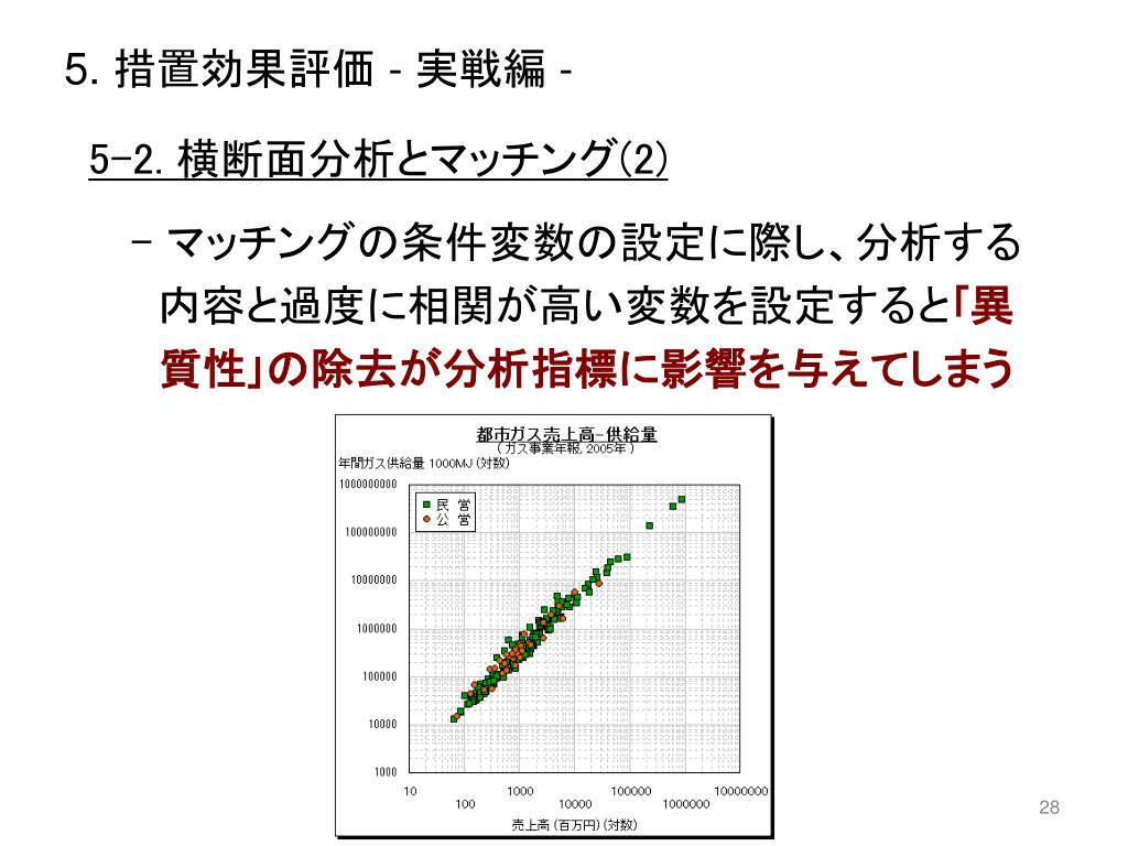 5. 措置効果評価 - 実戦編 - 5-1. 横断面分析とマッチング(1) - 都市ガス事業は 2005年時点で民営178社・公営 36社が存在するが、生産性を民間・公営間で比 較する場合、事業の「異質性」に注意が必要 27