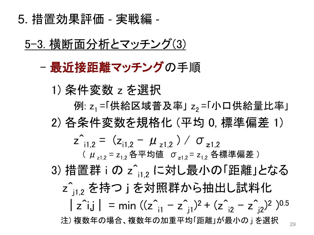 5. 措置効果評価 - 実戦編 - 5-3. 横断面分析とマッチング(3) - 最近接距離マッチングの手順 1) 条件変数 z を選択 例: z1=「供給区域普及率」 z2 =「小口供給量比率」 2) 各条件変数を規格化 (平均 0, 標準偏差 1) z^i1,2 = (zi1,2 – μz1,2 ) / σz1,2 ( μz1,2 = z1,2 各平均値 σz1,2 = z1,2各標準偏差 ) 3) 措置群 i の z^i1,2に対し最小の「距離」となる z^j1,2を持つ j を対照群から抽出し試料化 | z^i,j |= min ((z^i1 – z^j1)2 + (z^i2 – z^j2)2 )0.5 注) 複数年の場合、複数年の加重平均「距離」が最小の j を選択 29