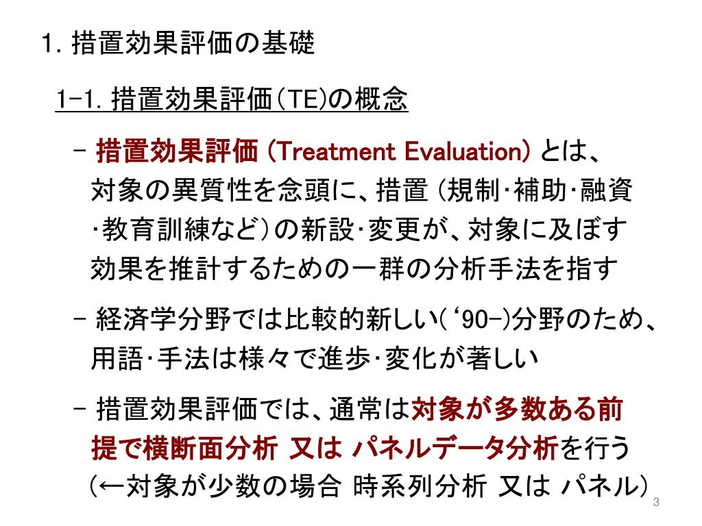 1. 措置効果評価の基礎 1-1. 措置効果評価(TE)の概念 - 措置効果評価 (Treatment Evaluation) とは、 対象の異質性を念頭に、措置 (規制・補助・融資 ・教育訓練など)の新設・変更が、対象に及ぼす 効果を推計するための一群の分析手法を指す - 経済学分野では比較的新しい(‘90-)分野のため、 用語・手法は様々で進歩・変化が著しい - 措置効果評価では、通常は対象が多数ある前 提で横断面分析 又は パネルデータ分析を行う (←対象が少数の場合 時系列分析 又は パネル) 3