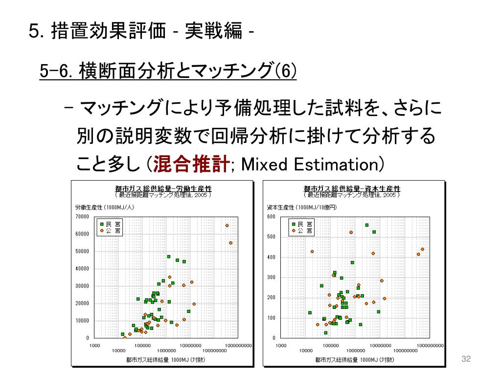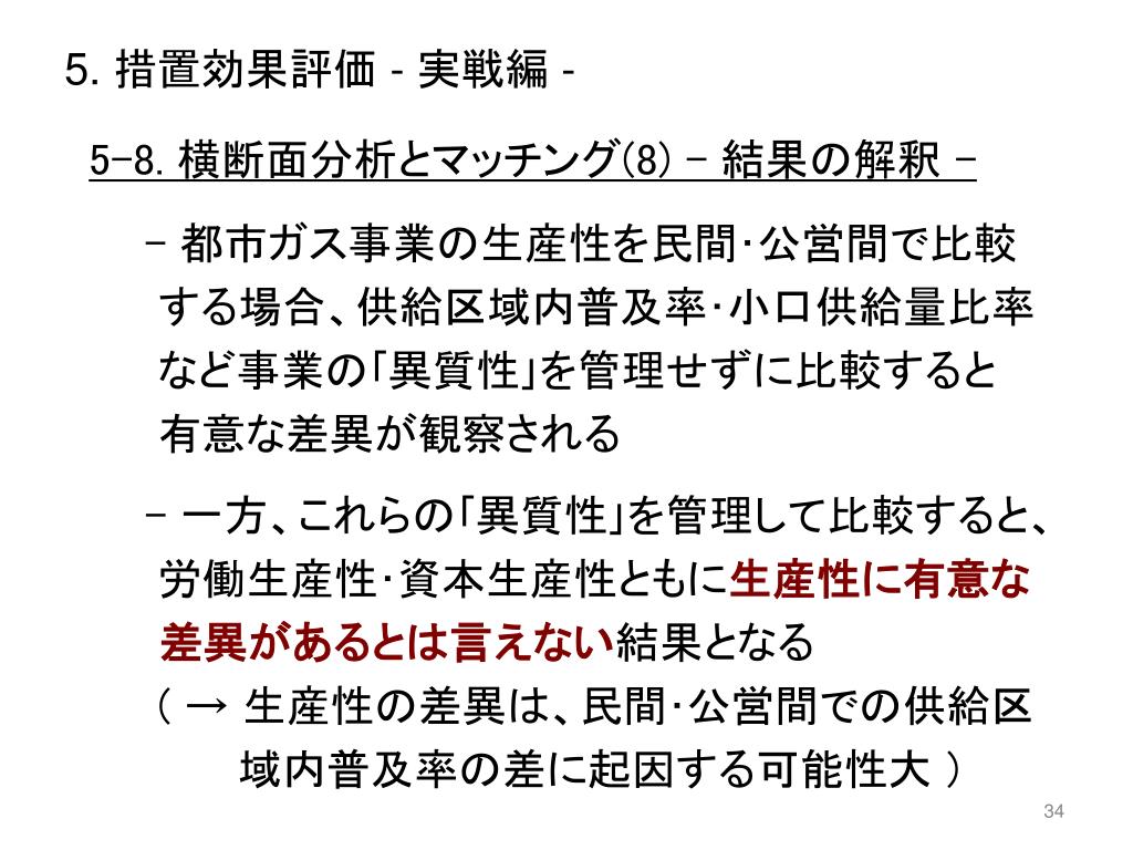 民営都市ガス事業 労働生産性を 総供給量(対数) で回帰 公営都市ガス事業 労働生産性を 総供給量(対数) で回帰 5. 措置効果評価 - 実戦編 - 5-7. 横断面分析とマッチング(7) - 混合推計 - - マッチング処理した試料を再度回帰分析 33