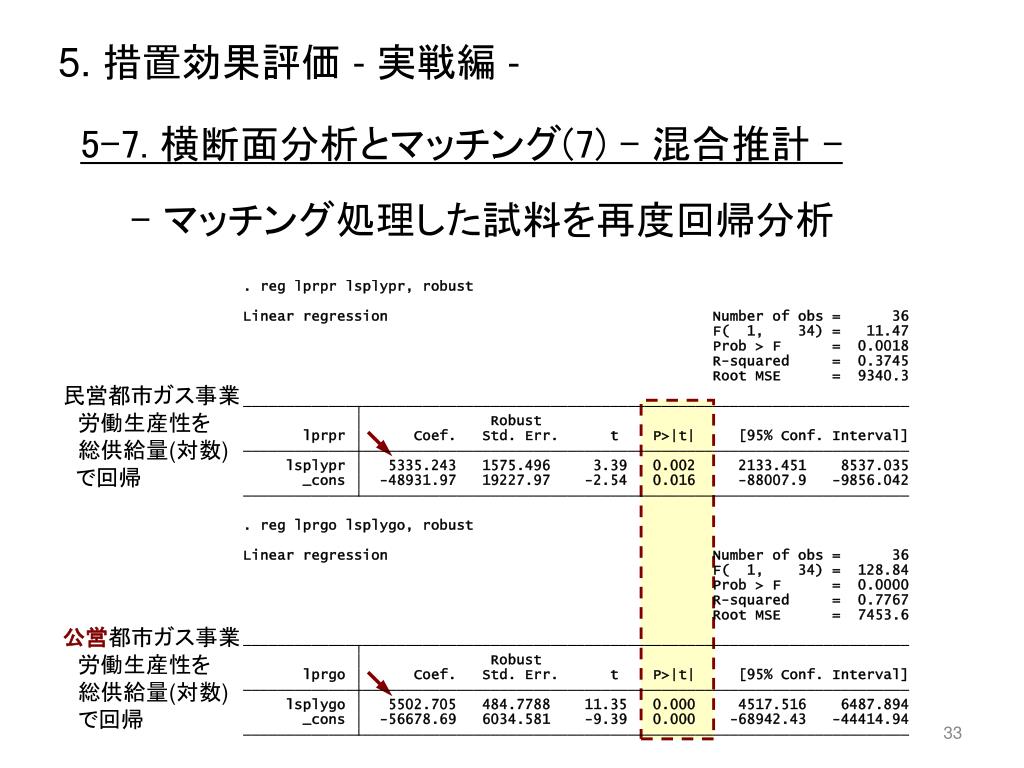 5. 措置効果評価 - 実戦編 - 5-6. 横断面分析とマッチング(6) - マッチングにより予備処理した試料を、さらに 別の説明変数で回帰分析に掛けて分析する こと多し (混合推計; Mixed Estimation) 32
