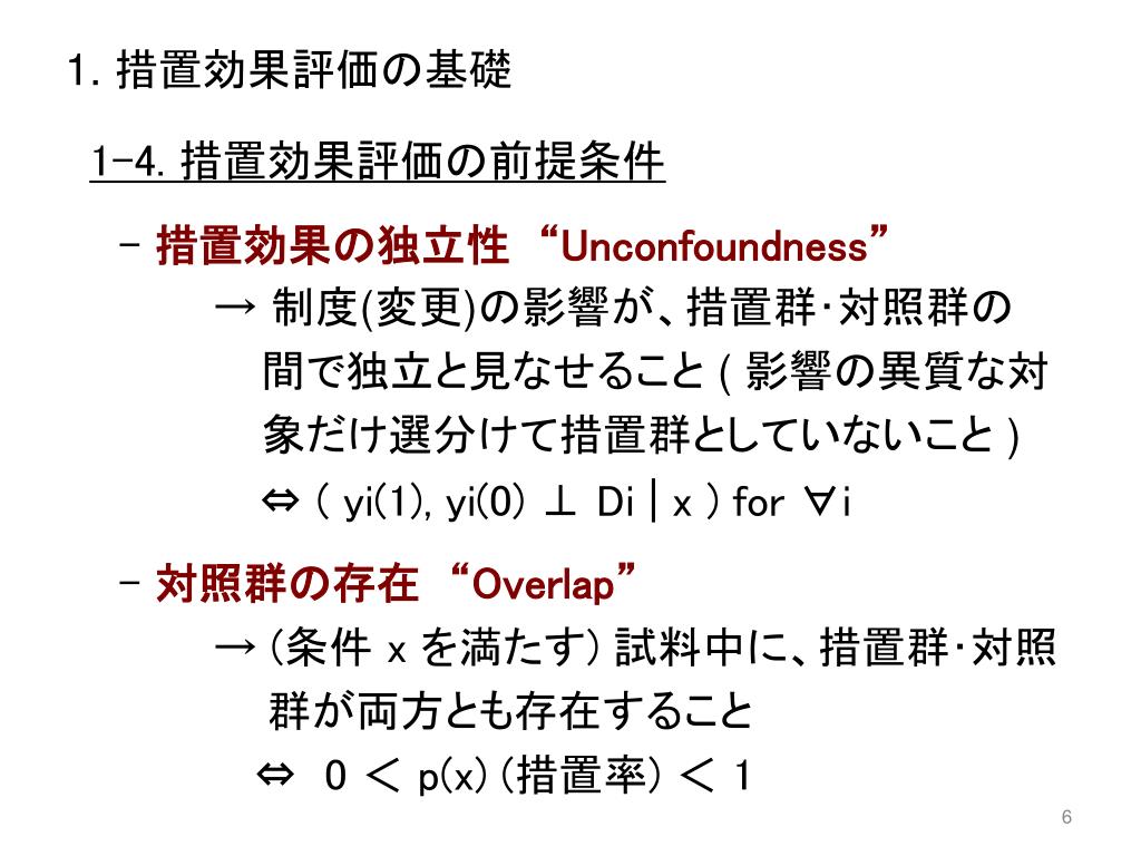 1. 措置効果評価の基礎 1-3. 措置効果評価の基本用語 Di : 対象i への措置の有無( = 1 or 0 ) N1, N0 : 措置群(Di=1), 対照群(Di=0) の試料数 yi ≡ yi(Di) = yi(1) or yi(0) (単に y1 or y0 も多用) yi(1) : 対象i が措置群となった場合の結果指標 yi(0) : 対象i が対照群となった(= 措置されない) 場合の結果指標 p(x) or p(x,t) : 措置率 Propensity score 条件 x に該当する全試料中、措置群となる 確率 (= N1/(N1+N0)|x, 但し要推計の場合有) 5