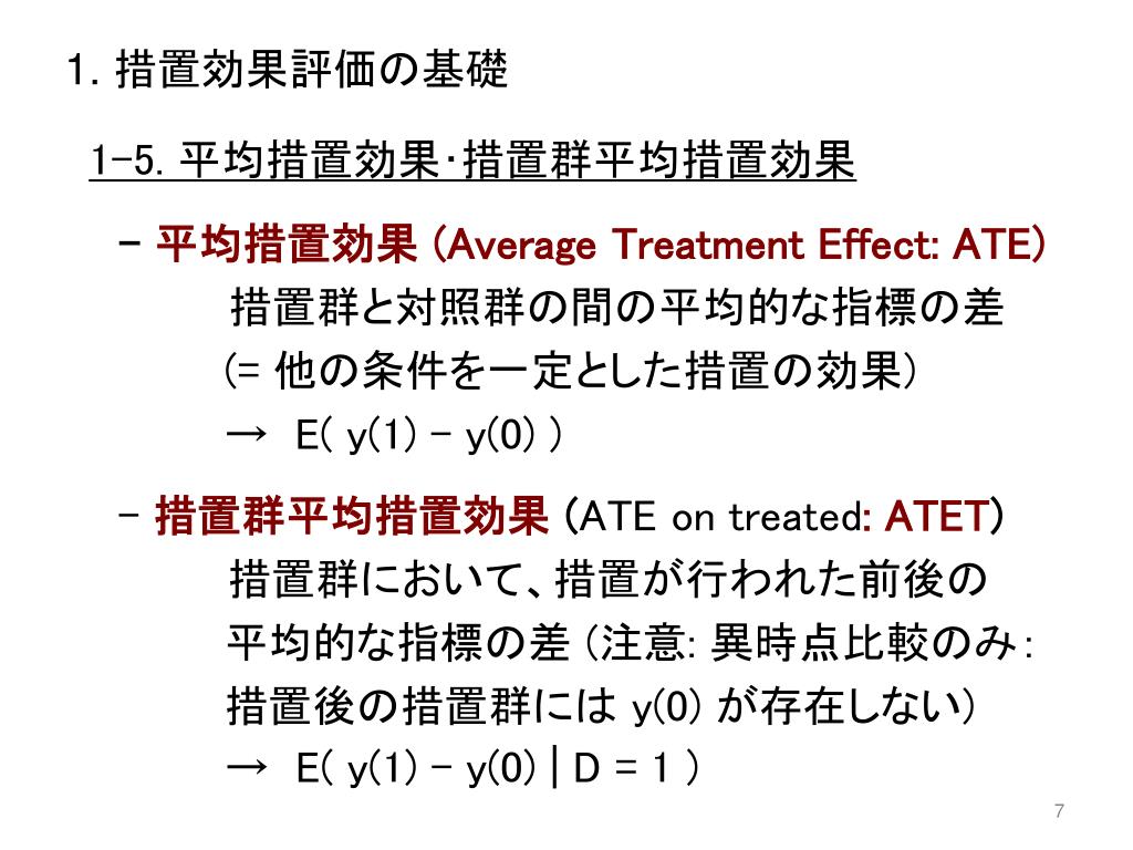 1. 措置効果評価の基礎 1-4. 措置効果評価の前提条件 - 措置効果の独立性 “Unconfoundness” → 制度(変更)の影響が、措置群・対照群の 間で独立と見なせること ( 影響の異質な対 象だけ選分けて措置群としていないこと ) ⇔ ( yi(1), yi(0) ⊥ Di | x )for ∀i - 対照群の存在 “Overlap” → (条件 x を満たす) 試料中に、措置群・対照 群が両方とも存在すること ⇔ 0 < p(x) (措置率) < 1 6