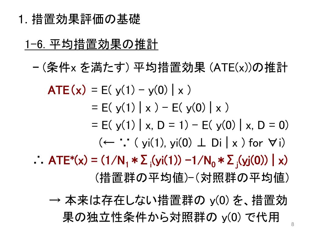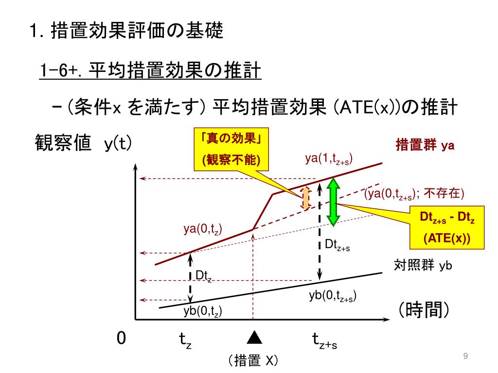 1. 措置効果評価の基礎 1-6. 平均措置効果の推計 - (条件x を満たす) 平均措置効果 (ATE(x))の推計 ATE(x)= E( y(1) – y(0) | x ) = E( y(1) | x ) – E( y(0) | x ) = E( y(1) | x, D = 1) – E( y(0) | x, D = 0) (← ∵ ( yi(1), yi(0) ⊥ Di | x )for ∀i) ∴ ATE*(x) = (1/N1 *Σi(yi(1)) –1/N0 *Σj(yj(0))| x) (措置群の平均値)–(対照群の平均値) → 本来は存在しない措置群の y(0) を、措置効 果の独立性条件から対照群の y(0) で代用 8