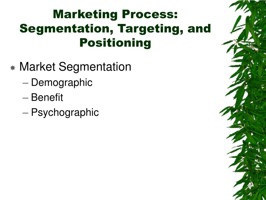 Marketing Process: Segmentation, Targeting, and Positioning • Market Segmentation • Demographic • Benefit • Psychographic