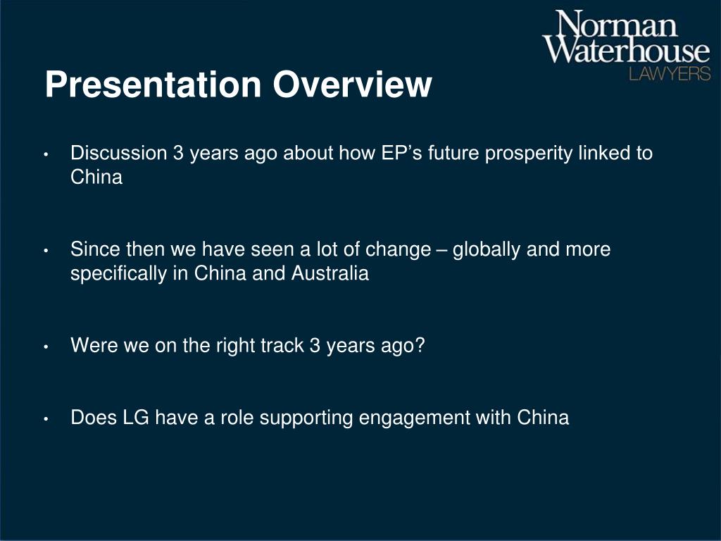 Presentation Overview • Discussion 3 years ago about how EP’s future prosperity linked to China • Since then we have seen a lot of change – globally and more specifically in China and Australia • Were we on the right track 3 years ago? • Does LG have a role supporting engagement with China