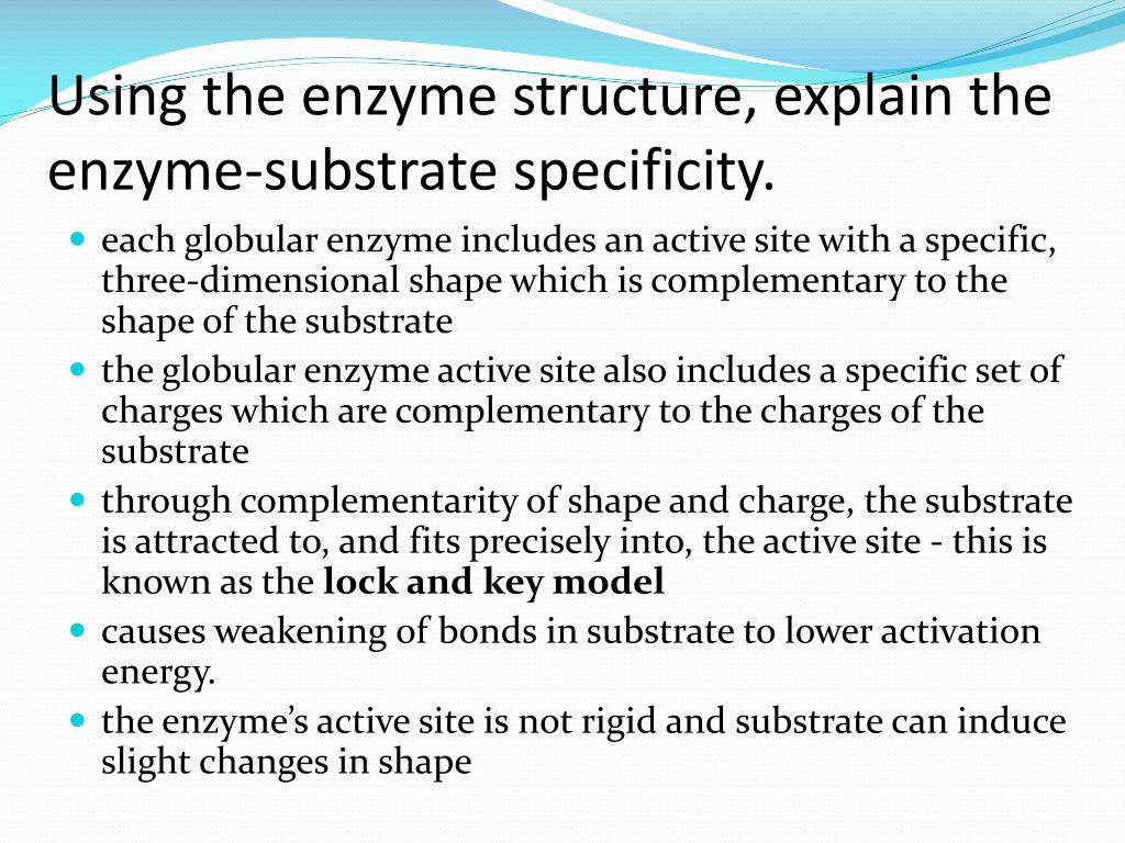 Using the enzyme structure, explain the enzyme-substrate specificity. • each globular enzyme includes an active site with a specific, three-dimensional shape which is complementary to the shape of the substrate • the globular enzyme active site also includes a specific set of charges which are complementary to the charges of the substrate • through complementarity of shape and charge, the substrate is attracted to, and fits precisely into, the active site - this is known as the lock and key model • causes weakening of bonds in substrate to lower activation energy. • the enzyme’s active site is not rigid and substrate can induce slight changes in shape