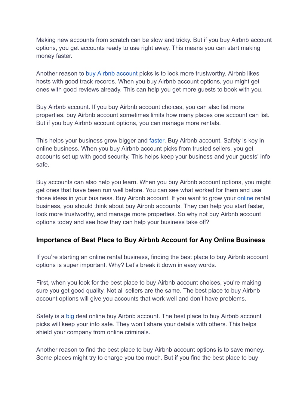 Making new accounts from scratch can be slow and tricky. But if you buy Airbnb account options, you get accounts ready to use right away. This means you can start making money faster. Another reason to buy Airbnb account picks is to look more trustworthy. Airbnb likes hosts with good track records. When you buy Airbnb account options, you might get ones with good reviews already. This can help you get more guests to book with you. Buy Airbnb account. If you buy Airbnb account choices, you can also list more properties. buy Airbnb account sometimes limits how many places one account can list. But if you buy Airbnb account options, you can manage more rentals. This helps your business grow bigger and faster. Buy Airbnb account. Safety is key in online business. When you buy Airbnb account picks from trusted sellers, you get accounts set up with good security. This helps keep your business and your guests’ info safe. Buy accounts can also help you learn. When you buy Airbnb account options, you might get ones that have been run well before. You can see what worked for them and use those ideas in your business. Buy Airbnb account. If you want to grow your online rental business, you should think about buy Airbnb accounts. They can help you start faster, look more trustworthy, and manage more properties. So why not buy Airbnb account options today and see how they can help your business take off? Importance of Best Place to Buy Airbnb Account for Any Online Business If you’re starting an online rental business, finding the best place to buy Airbnb account options is super important. Why? Let’s break it down in easy words. First, when you look for the best place to buy Airbnb account choices, you’re making sure you get good quality. Not all sellers are the same. The best place to buy Airbnb account options will give you accounts that work well and don’t have problems. Safety is a big deal online buy Airbnb account. The best place to buy Airbnb account picks will keep your info safe. They won’t share your details with others. This helps shield your company from online criminals. Another reason to find the best place to buy Airbnb account options is to save money. Some places might try to charge you too much. But if you find the best place to buy