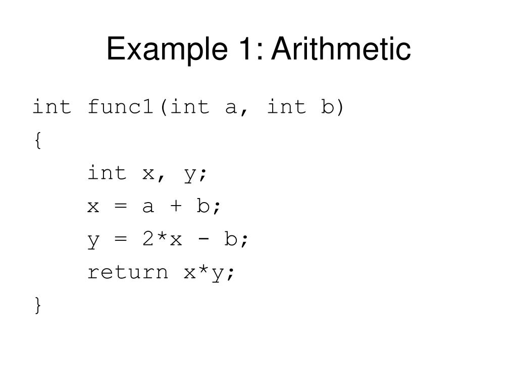 Example 1: Arithmetic int func1(int a, int b) { int x, y; x = a + b; y = 2*x - b; return x*y; }