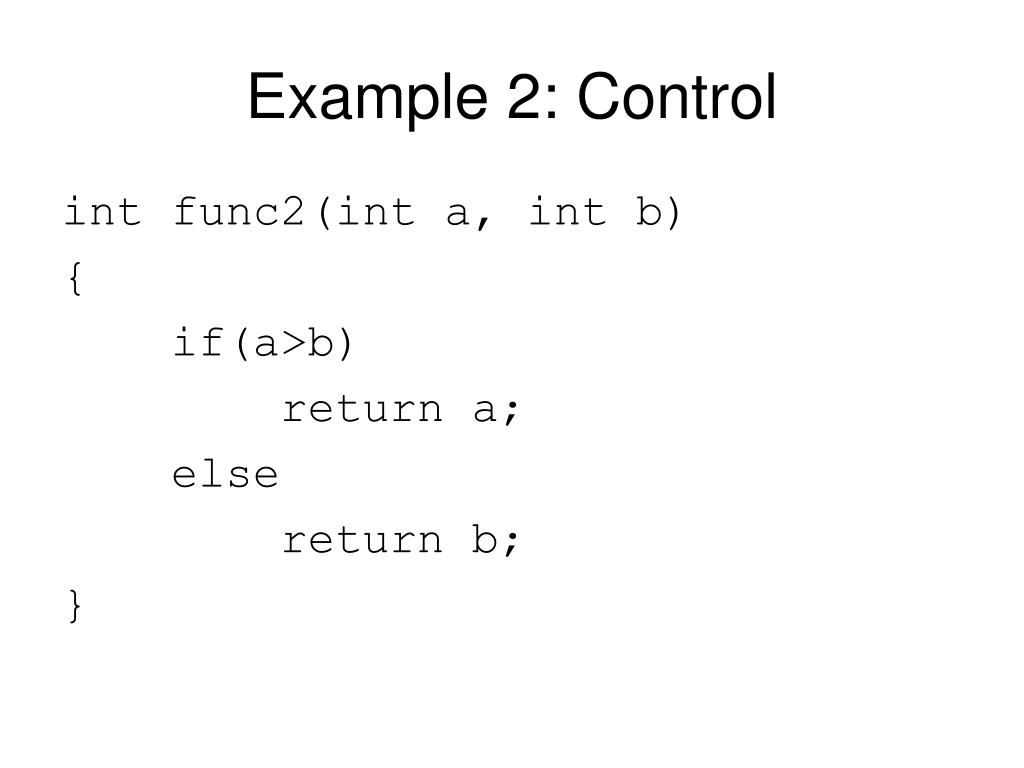 Example 2: Control int func2(int a, int b) { if(a>b) return a; else return b; }