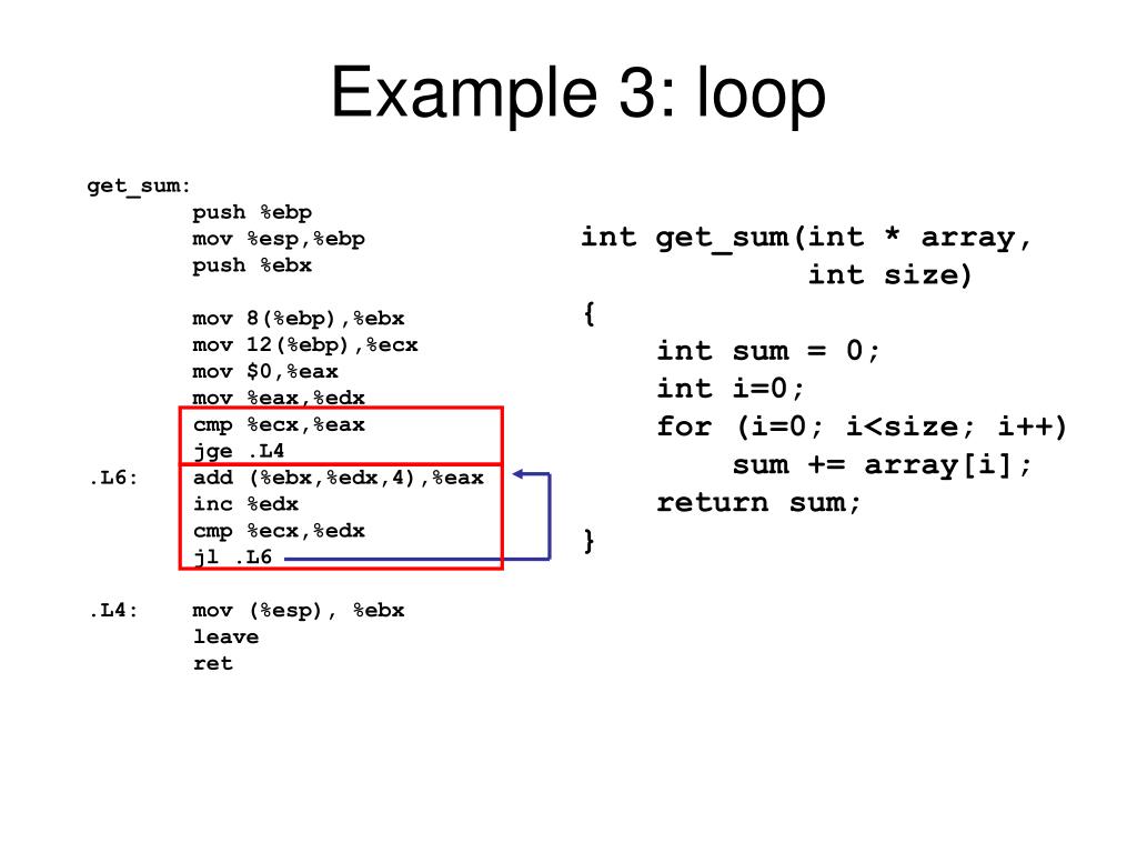 get_sum: push %ebp mov %esp,%ebp push %ebx mov 8(%ebp),%ebx mov 12(%ebp),%ecx mov $0,%eax mov %eax,%edx cmp %ecx,%eax jge .L4 .L6: add (%ebx,%edx,4),%eax inc %edx cmp %ecx,%edx jl .L6 .L4: mov (%esp), %ebx leave ret Example 3: loop int get_sum(int * array, int size) { int sum = 0; int i=0; for (i=0; i<size; i++) sum += array[i]; return sum; }