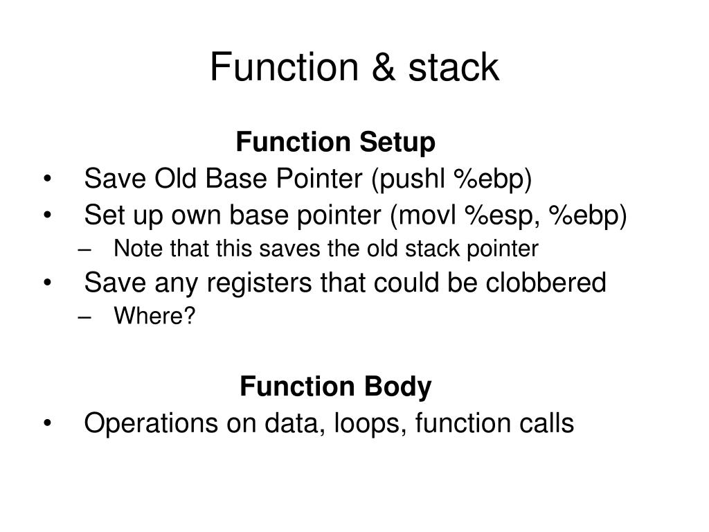 Function & stack Function Setup • Save Old Base Pointer (pushl %ebp) • Set up own base pointer (movl %esp, %ebp) • Note that this saves the old stack pointer • Save any registers that could be clobbered • Where? Function Body • Operations on data, loops, function calls