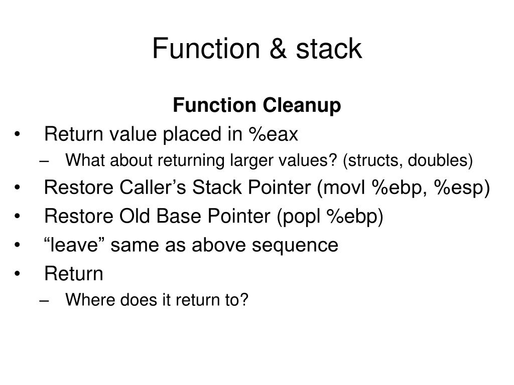 Function & stack Function Cleanup • Return value placed in %eax • What about returning larger values? (structs, doubles) • Restore Caller’s Stack Pointer (movl %ebp, %esp) • Restore Old Base Pointer (popl %ebp) • “leave” same as above sequence • Return • Where does it return to?