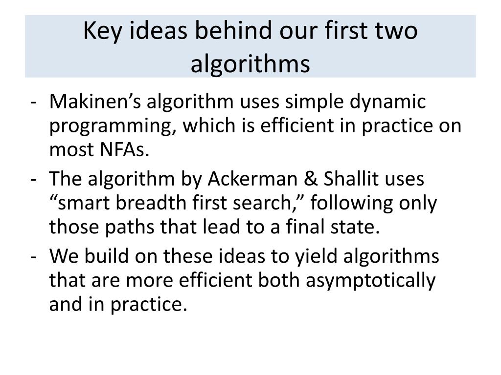 Key ideas behind our first two algorithms • Makinen’s algorithm uses simple dynamic programming, which is efficient in practice on most NFAs. • The algorithm by Ackerman & Shallit uses “smart breadth first search,” following only those paths that lead to a final state. • We build on these ideas to yield algorithms that are more efficient both asymptotically and in practice.