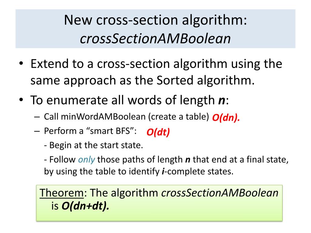 New cross-section algorithm: crossSectionAMBoolean O(dn). O(dt) Theorem: The algorithm crossSectionAMBoolean is O(dn+dt). • Extend to a cross-section algorithm using the same approach as the Sorted algorithm. • To enumerate all words of length n: • Call minWordAMBoolean (create a table) • Perform a “smart BFS”: - Begin at the start state. - Follow only those paths of length n that end at a final state, by using the table to identify i-complete states.
