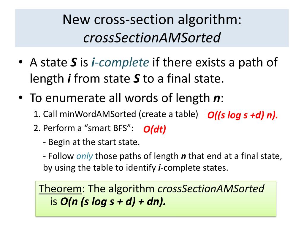New cross-section algorithm: crossSectionAMSorted • A state S is i-complete if there exists a path of length i from state S to a final state. • To enumerate all words of length n: 1. Call minWordAMSorted (create a table) 2. Perform a “smart BFS”: - Begin at the start state. - Follow only those paths of length n that end at a final state, by using the table to identify i-complete states. O((s log s +d) n). O(dt) Theorem: The algorithm crossSectionAMSorted is O(n (s log s + d) + dn).