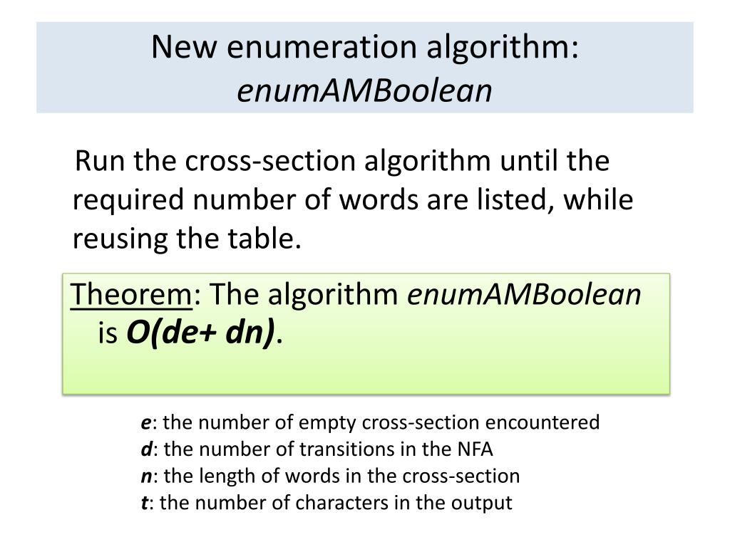 New enumeration algorithm: enumAMBoolean Theorem: The algorithm enumAMBoolean is O(de+ dn). • e:the number of empty cross-section encountered • d: the number of transitions in the NFA • n: the length of words in the cross-section • t:the number of characters in the output Run the cross-section algorithm until the required number of words are listed, while reusing the table.