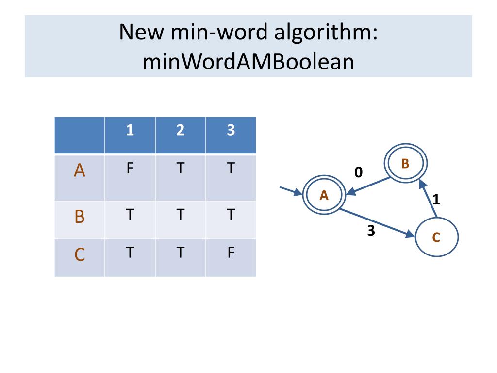 New min-word algorithm: minWordAMBoolean B 0 A 1 3 C