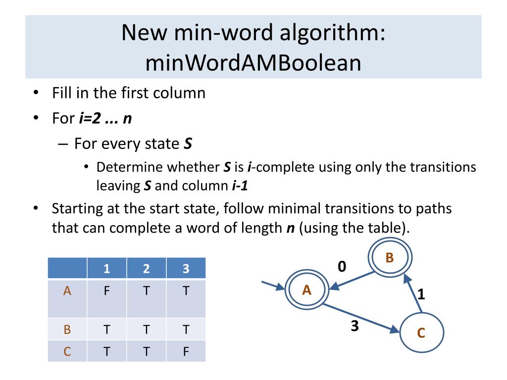 New min-word algorithm: minWordAMBoolean • Fill in the first column • For i=2 ... n • For every state S • Determine whether S is i-complete using only the transitions leaving S and column i-1 • Starting at the start state, follow minimal transitions to paths that can complete a word of length n (using the table). B 0 A 1 3 C