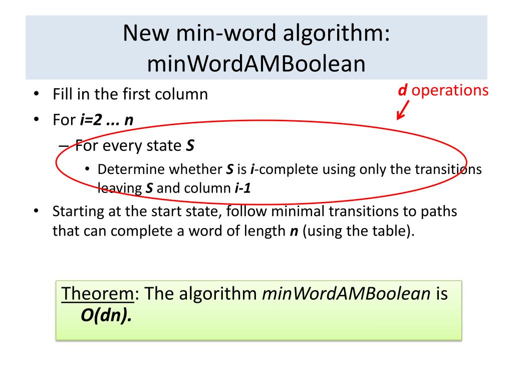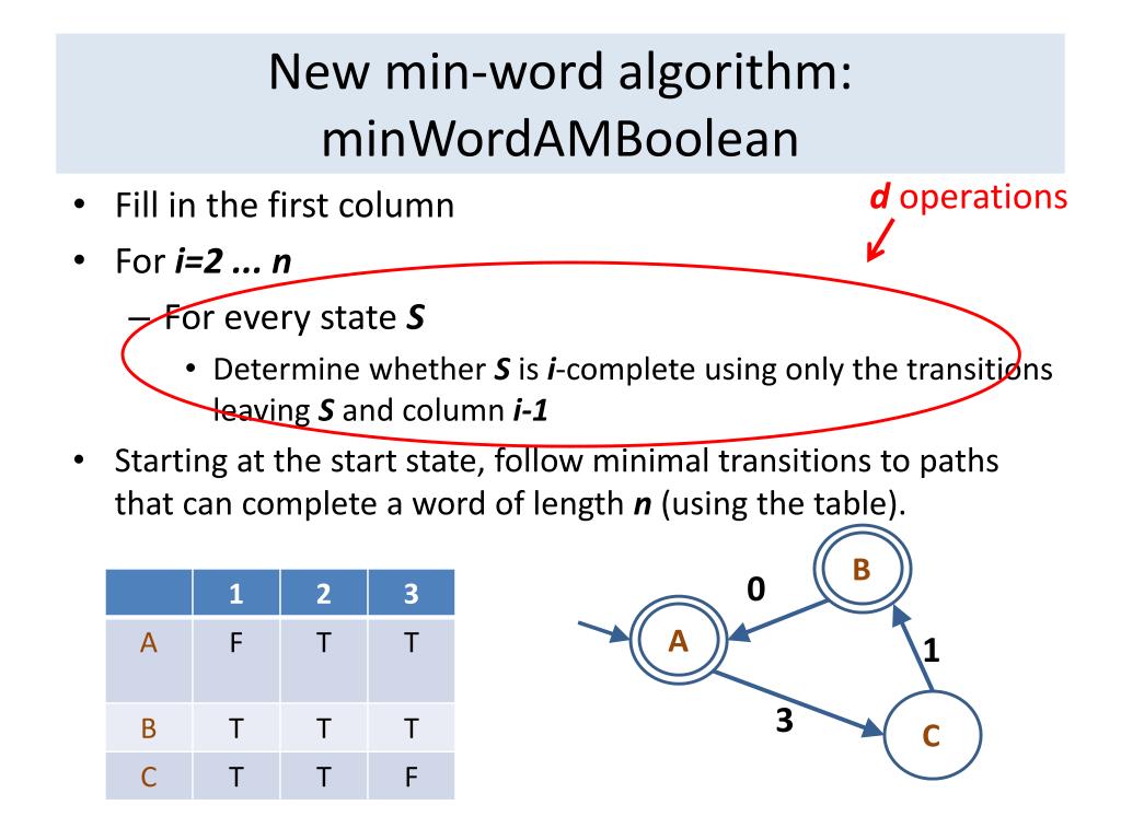New min-word algorithm: minWordAMBoolean d operations • Fill in the first column • For i=2 ... n • For every state S • Determine whether S is i-complete using only the transitions leaving S and column i-1 • Starting at the start state, follow minimal transitions to paths that can complete a word of length n (using the table). Theorem: The algorithm minWordAMBooleanis O(dn).