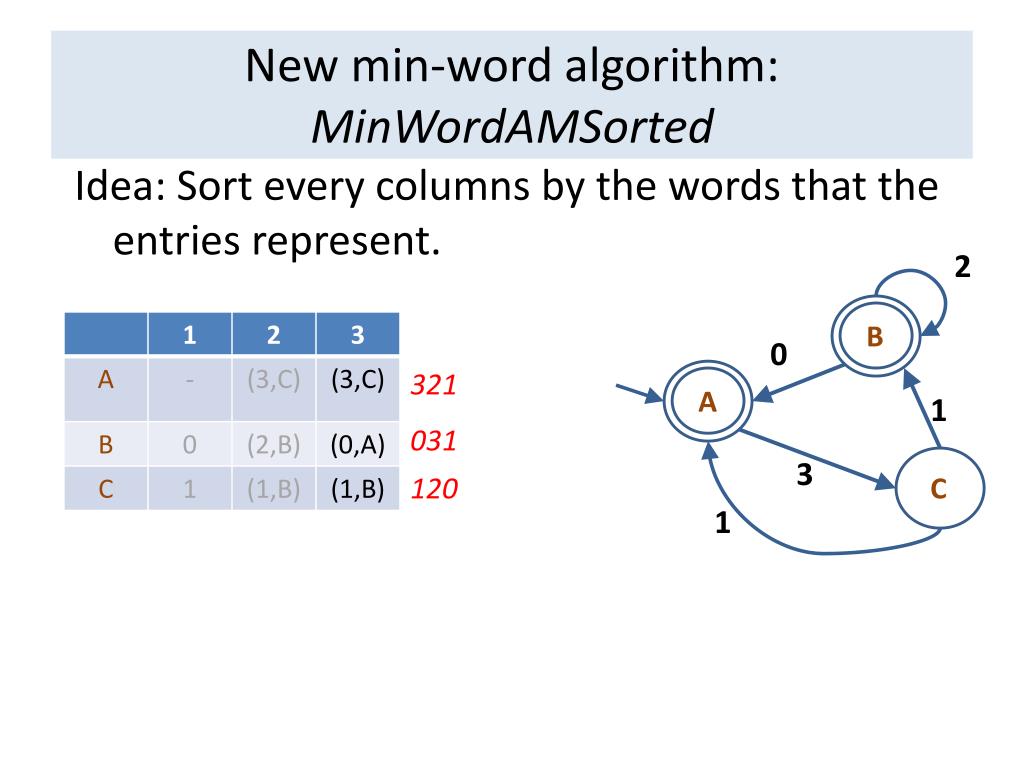 New min-word algorithm: MinWordAMSorted Idea: Sort every columns by the words that the entries represent. 2 B 0 321 A 1 031 3 120 C 1