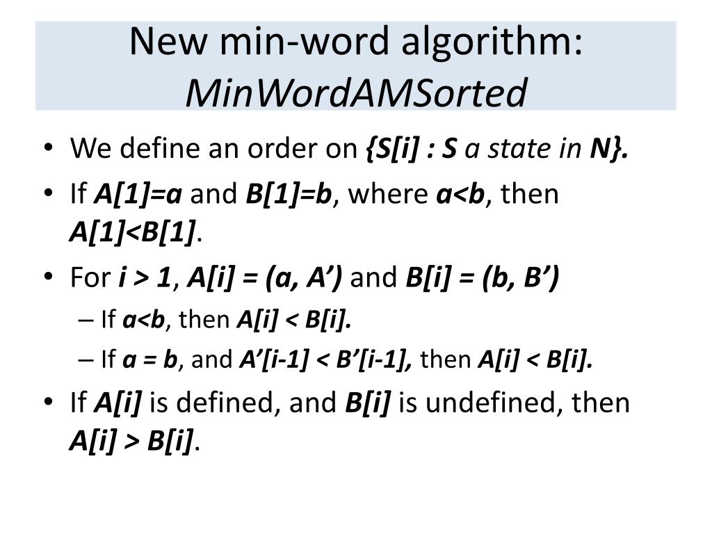 New min-word algorithm: MinWordAMSorted • We define an order on {S[i] : S a state in N}. • If A[1]=a and B[1]=b, where a<b, then A[1]<B[1]. • For i > 1, A[i] = (a, A’) and B[i] = (b, B’) • If a<b, then A[i] < B[i]. • If a = b, and A’[i-1] < B’[i-1], then A[i] < B[i]. • If A[i] is defined, and B[i] is undefined, then A[i] > B[i].