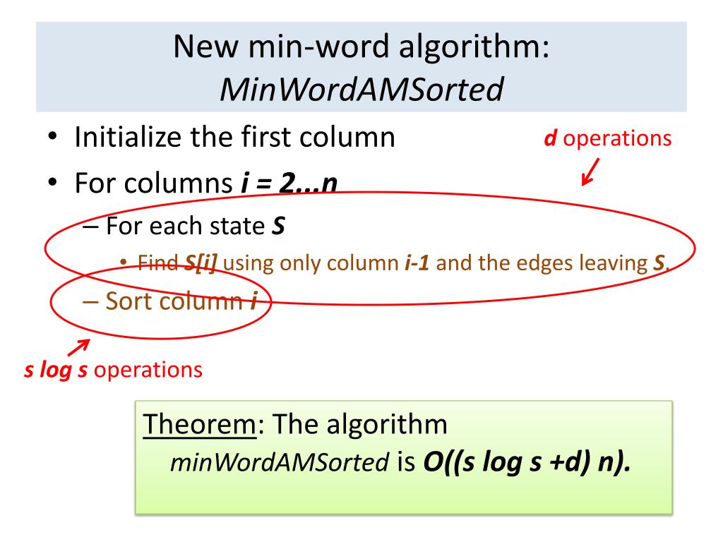New min-word algorithm: MinWordAMSorted d operations • Initialize the first column • For columns i = 2...n • For each state S • Find S[i] using only column i-1 and the edges leaving S. • Sort column i s log s operations Theorem: The algorithm minWordAMSorted is O((s log s +d) n).
