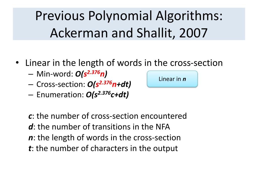 Previous Polynomial Algorithms: Ackerman and Shallit, 2007 • Linear in the length of words in the cross-section • Min-word: O(s2.376n) • Cross-section: O(s2.376n+dt) • Enumeration: O(s2.376c+dt) c:the number of cross-section encountered d: the number of transitions in the NFA n: the length of words in the cross-section t:the number of characters in the output Linear in n